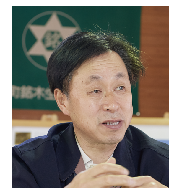「弊社は私の父の代、昭和47年に個人事業として発足し、令和2年の7月に法人化いたしました。現在社員は4名、役員は私も含めて3名です。年間の素材生産 は約1,000㎥です。北山磨丸太に関しては年間約2,000本を生産しています。近くでもう1か所北山磨丸太を扱っている組合があり、そちらと合わせて北山地域全体の生産総数でも25,000本ほどだと思います。北山杉も北山磨丸太も京都の伝統工芸品であり、「京都府伝統工芸品」や「京都市伝統産業品」の指定を受けています。「北山磨丸太」は「北山杉」とともに地域団体商標を取得しており、北山磨丸太には一本一本に通し番号の入ったシールを貼り、品質を保持することによりブランドとしての価値を守っています。ただ、北山磨丸太を扱う生産者は年々減少しています。最盛期には120社を超えていたのですが、現在は27社です。ほとんどが従事者の高齢化による廃業が理由ですが建築のトレンドが変わって需要が減少したことも大きな要因だと思われます。昭和50年から平成の初頭が最盛期でしたが、当時建築された観光ホテルや旅館、あるいは個人の住宅には和室があり床の間があったことを思い出せる人は多いと思います。そしてその床の間には北山磨丸太の床柱がセットで存在していました。高級な床柱を立てることがトレンドでありステータスの時代でした。